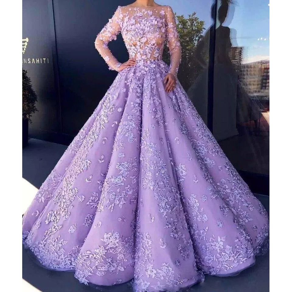 Fascinating Lavender Formal Evening Gowns Gorgeous Beaded Floral Applique Sheer Long Sleeves Evening Dress Sexy A Line Tulle Celebrity Dress Short