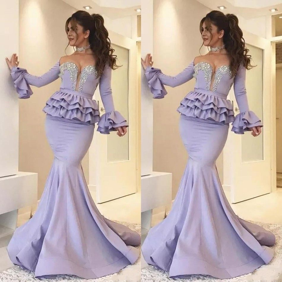 2019 Vintage See Through Lavender Mermaid Prom Dresses Long Sleeve Peplum Crystal Beads Floor Length Plus Size Formal Evening Party Gowns Stunning